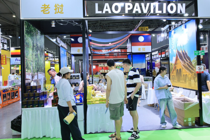 市民游客在老挝馆买产品。(主办方供图)